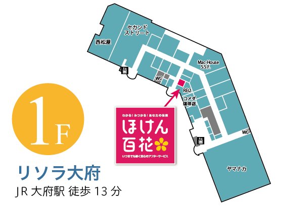 〒474-0053 愛知県大府市柊山町1-98 リソラ大府ショッピングテラス1FJR「大府駅」西口 徒歩13分 |