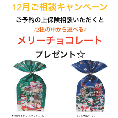 ほけん百花では期間中にご予約のうえ保険のご相談にご来店いただいたお客さまに「メリーチョコレート」をプレゼント!!(2種類からお選びいただけます)